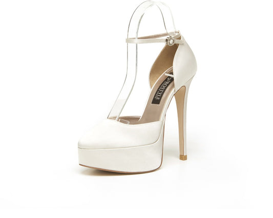ヒール8cm-14cm│ラウンドトゥアンクルストラップパンプス サテンホワイト